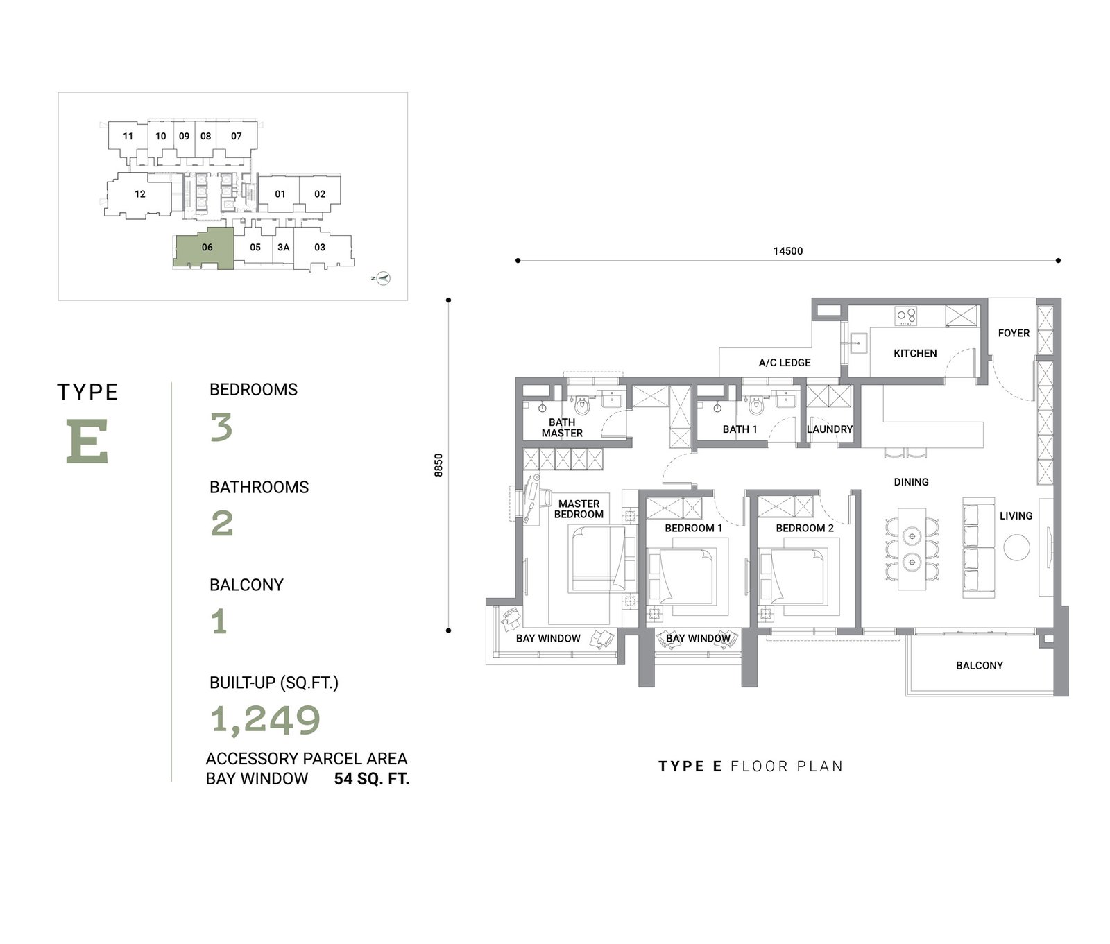 A generous 3-bedroom home equipped with elegant bay windows, a private balcony, and a dedicated laundry space. An ideal sanctuary for growing families seeking ample space and natural light.